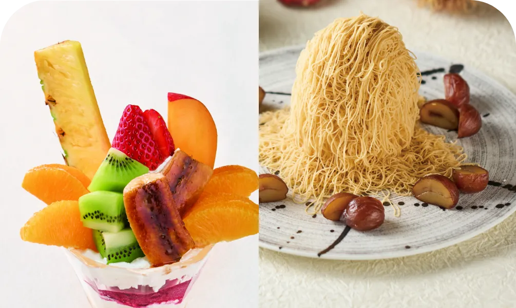 ※旬果実のフルーツパフェ、生絞りモンブラン旬果実添えは対象外です