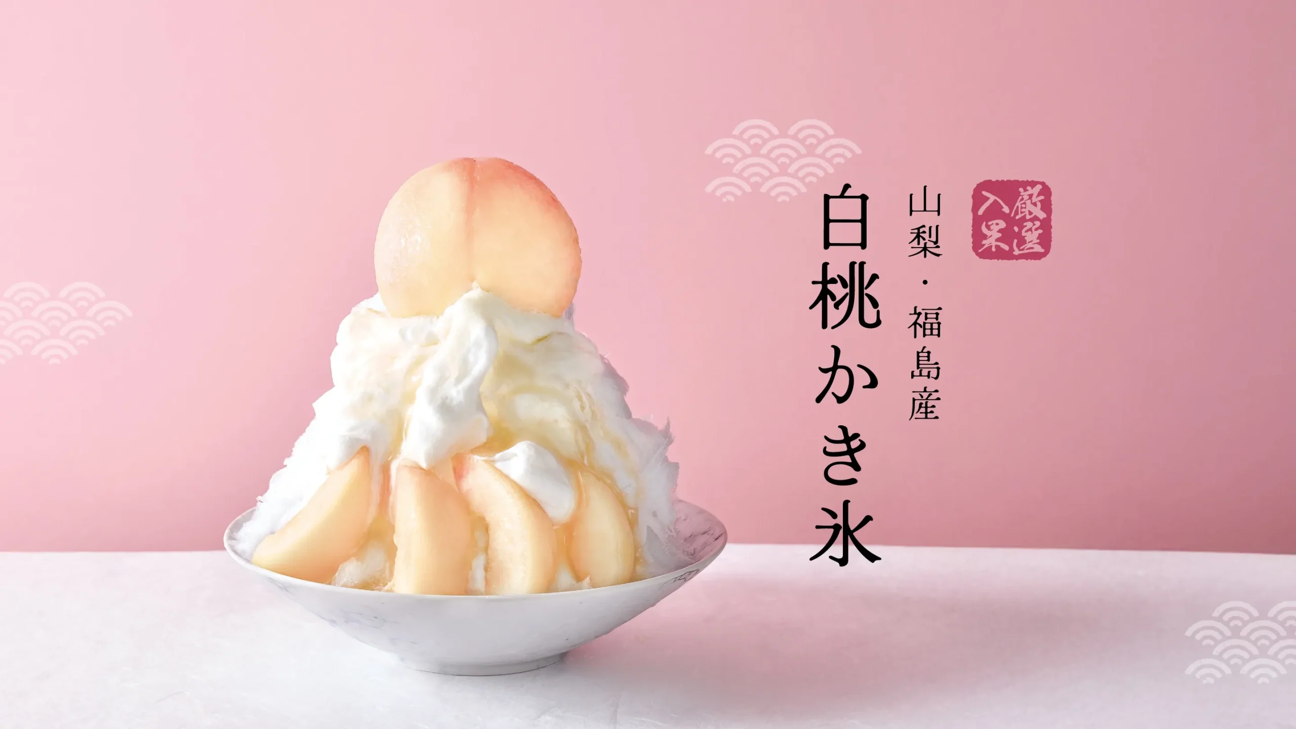 かき氷は、ふんわり削った氷に口溶けの良いミルクホイップ、山梨県産白桃で作った特製のソース、さらにフレッシュの白桃を添えました。
