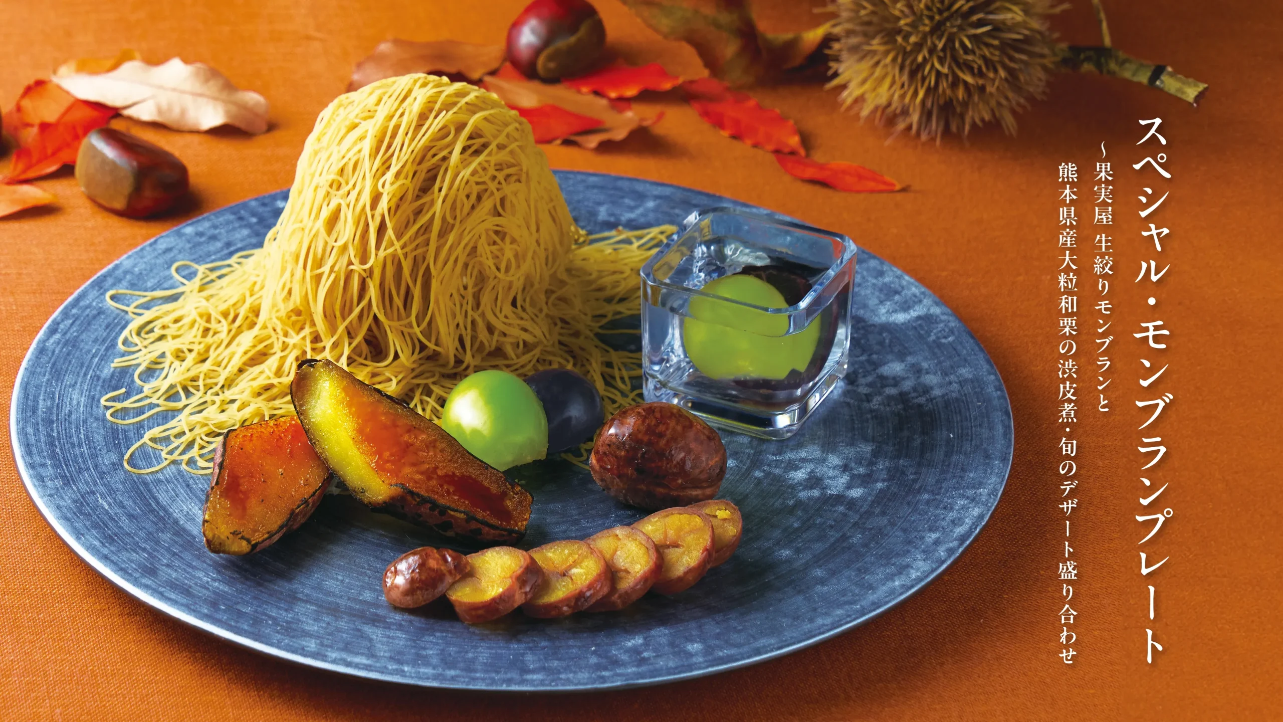 10月上旬から、スペシャル・モンブラン〜果実屋 生絞りモンブランと熊本県産大粒和栗の渋皮煮・季節デザートの盛り合わせが販売中です。