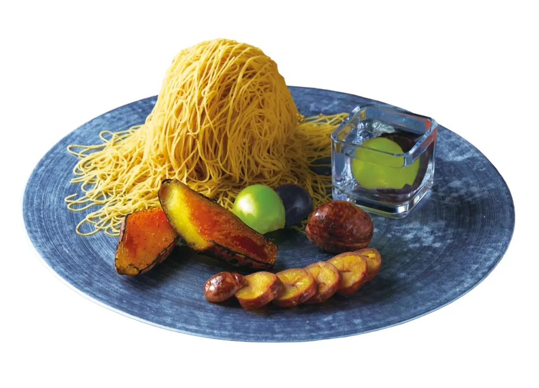 「果実屋 生絞りモンブラン」に、蜜いもの表面を香ばしくキャラメリゼした「蜜いものブリュレ」、ほっこりした食感と優しい甘さの「熊本県産大粒和栗の渋皮煮」、旬果実「シャインマスカットとクイーンルージュ」を2通りの食べ方で添えた贅沢なひとさら。